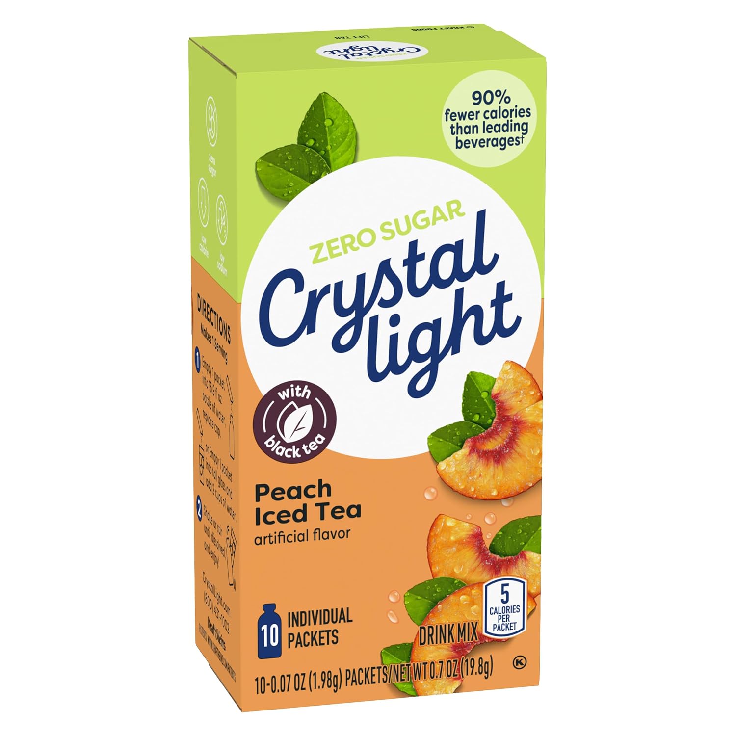 Crystal Light Artificially Flavored Peach Iced Tea On-the-Go Powdered Drink Mix is a light and refreshing beverage you can enjoy at any time of day. With zero grams of sugar and 5 calories per packet, Crystal Light peach iced tea is an ideal alternative to juice and soda and has 90% fewer calories than leading beverages (per 16 fl oz beverage, this product 5 calories; leading beverages 130 calories), so you don't have to choose between taste and calories. Low in sodium, our zero sugar drink mix features the great taste of black tea and refreshing peach. Each box in our 12-pack contains ten 0.07 ounce iced tea mix packets that are individually sealed and conveniently pre-portioned for easy mixing without measuring. When you're ready to savor some peach iced tea, simply empty packet contents into a bottle of water or tall glass with 2 cups of water. Shake or stir, and enjoy! Keep our handy powdered drink mix singles within reach—in your bag, pocket or car or school locker—to quench your thirst, no matter the activity or time of year. Just the way you like it with zero sugar and low calories. Crystal Light Peach Iced Tea On-the-Go Powdered Drink Mix is always a great choice for the whole family. Packed with flavor, without the sugar.