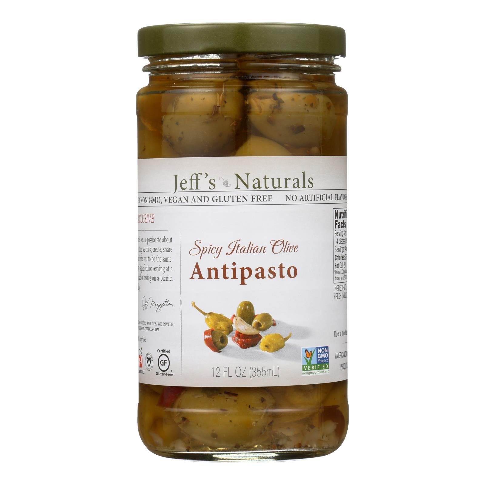 Jeff's naturals spicy italian olive antipasto is a colorful combination of large green olives, tangy peperoncini, rich red bell peppers and fresh, savory garlic, all marinated to perfection. Serve at a party, on a salad, or take on a picnic. Each 12 fl. Oz. Jar of antipasto is non-gmo, gluten-free, vegan and contains pits.