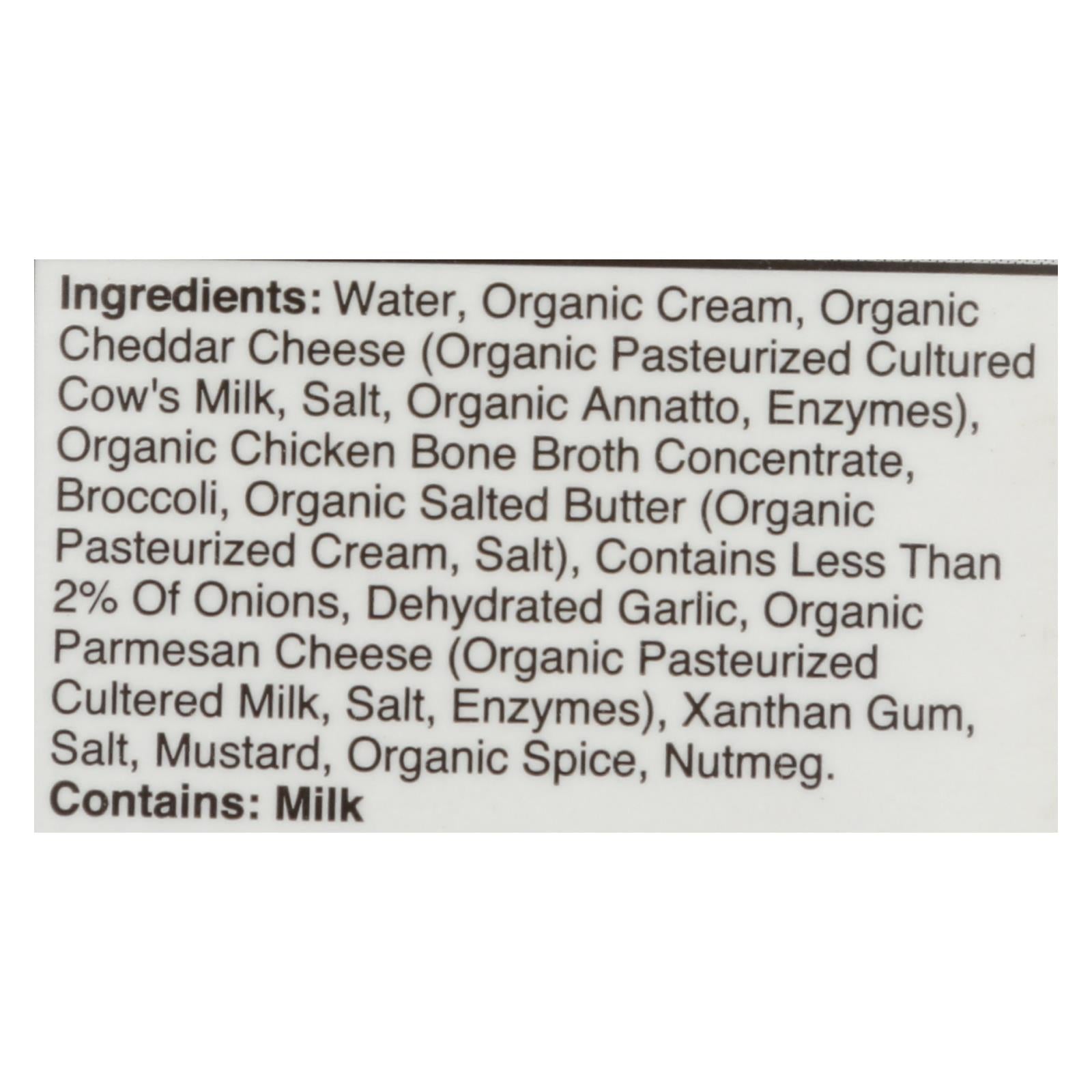 ingredients : water;organic cream;organic cheddar cheese;organic pasteurized cultured cow's milk;salt;organic annatto;enzymes;organic chicken bone broth;organic chicken bones;organic onions;organic carrots;organic fennel;organic leeks;organic apple cider vinegar;organic thyme;organic shiitake mushroom;organic tamarind extract;organic bay leaf;organic broccoli;organic butter;organic pasteurized cream;less than 2% of organic onions;organic garlic;organic parmesan cheese;organic pasteurized cultured milk;xanthan