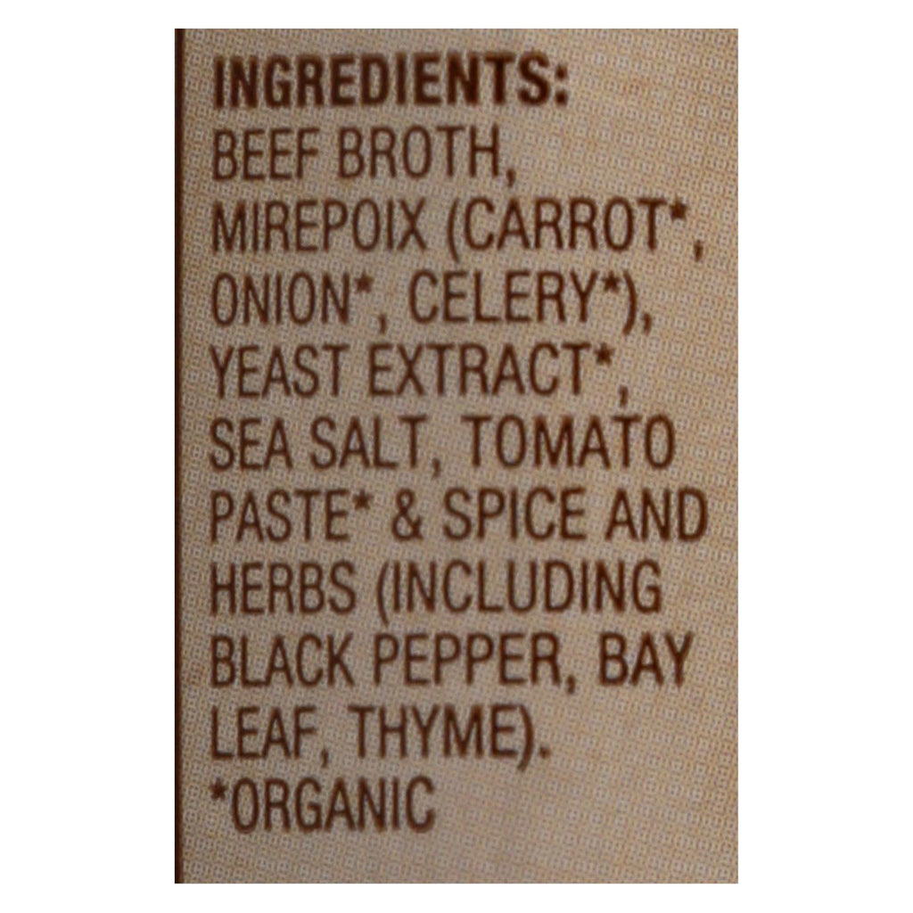 ingredients : beef broth;mirepoix;carrot;onion;celery;yeast extract;sea salt;tomato paste* & spice and herbs;including black pepper;bay leaf;thyme