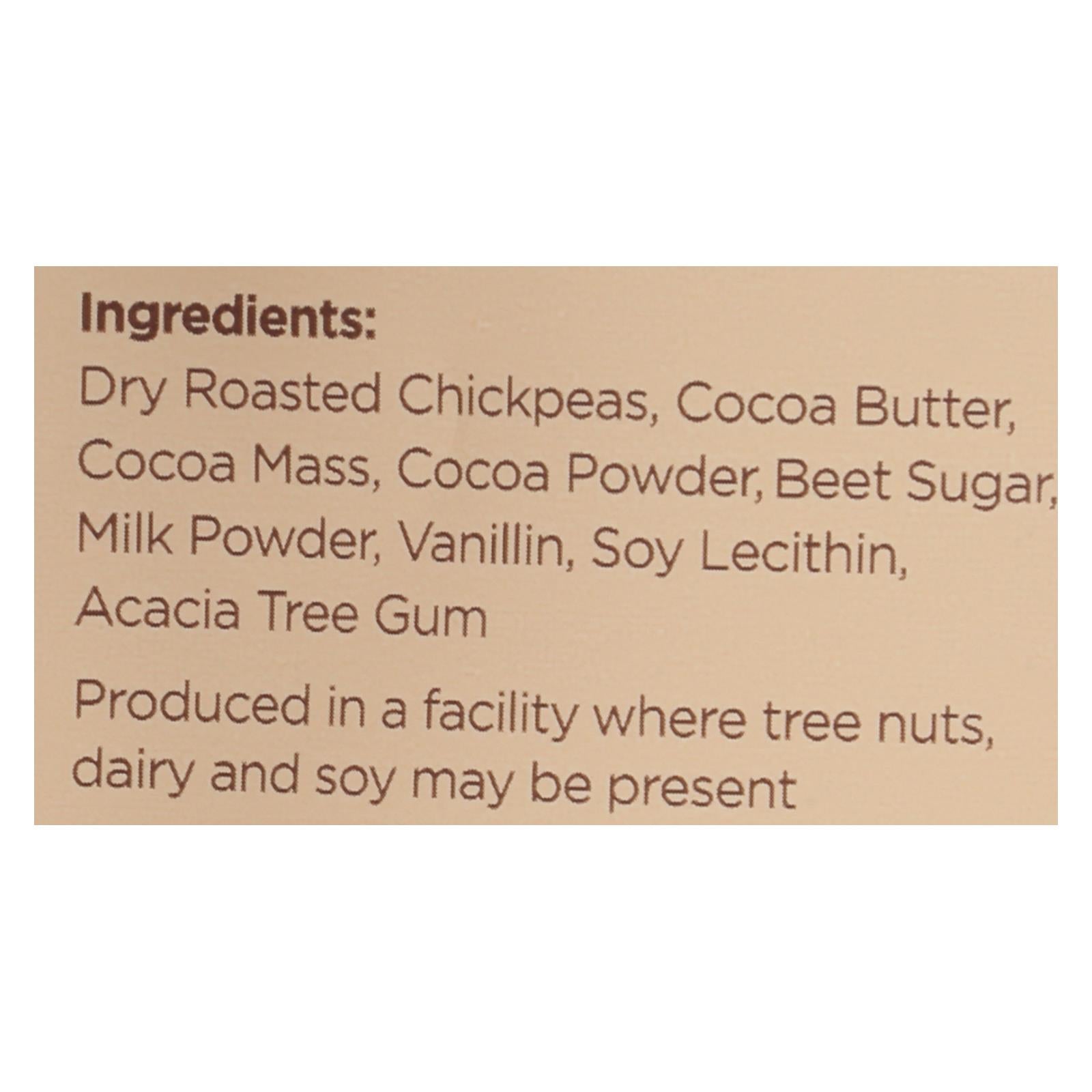 ingredients : dry roasted chickpeas;cocoa butter;cocoa mass;cocoa powder;beet sugar;milk powder;vanillin;soy lecithin;acacia tree gum