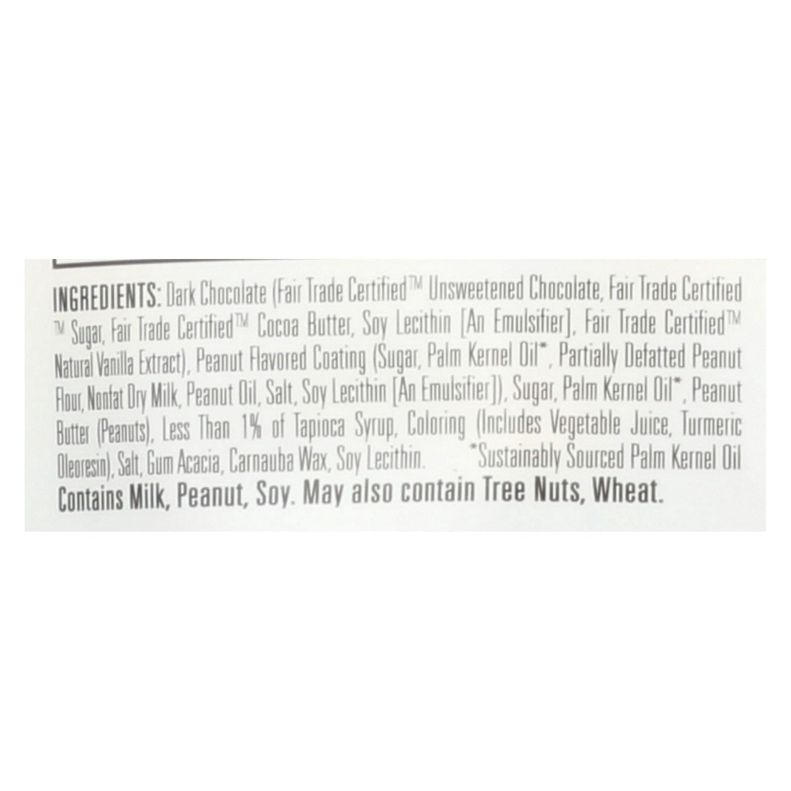 ingredients : dark chocolate (fair trade certified™ unsweetened chocolate, fair trade certified™ sugar, fair trade certified™ cocoa butter, soy lecithin [an emulsifier], fair trade certified™ natural vanilla extract);peanut flavored coating (sugar, palm kernel oil*, partially defatted peanut flour, nonfat dry milk, peanut oil, salt, soy lecithin [an emulsifier]);cane sugar;palm kernel oil;peanut butter (peanuts);less than 1% of coloring (includes vegetable juice, turmeric oleoresin);gum acacia;tapioca syrup;s