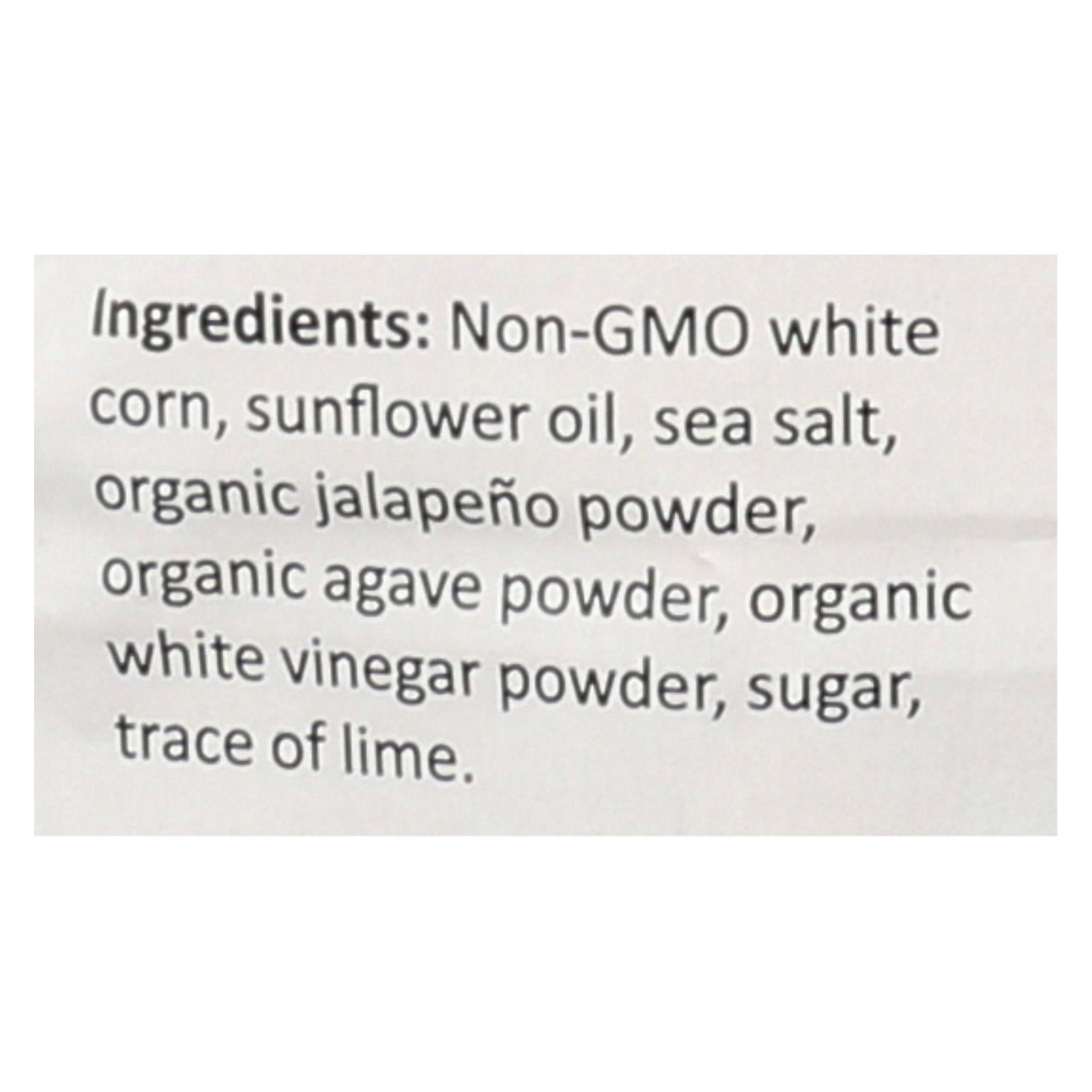 ingredients : non-gmo white corn;sunflower oil;sea salt;organic jalapeno powder;organic agave powder;organic white vinegar powder;sugar;trace of lime