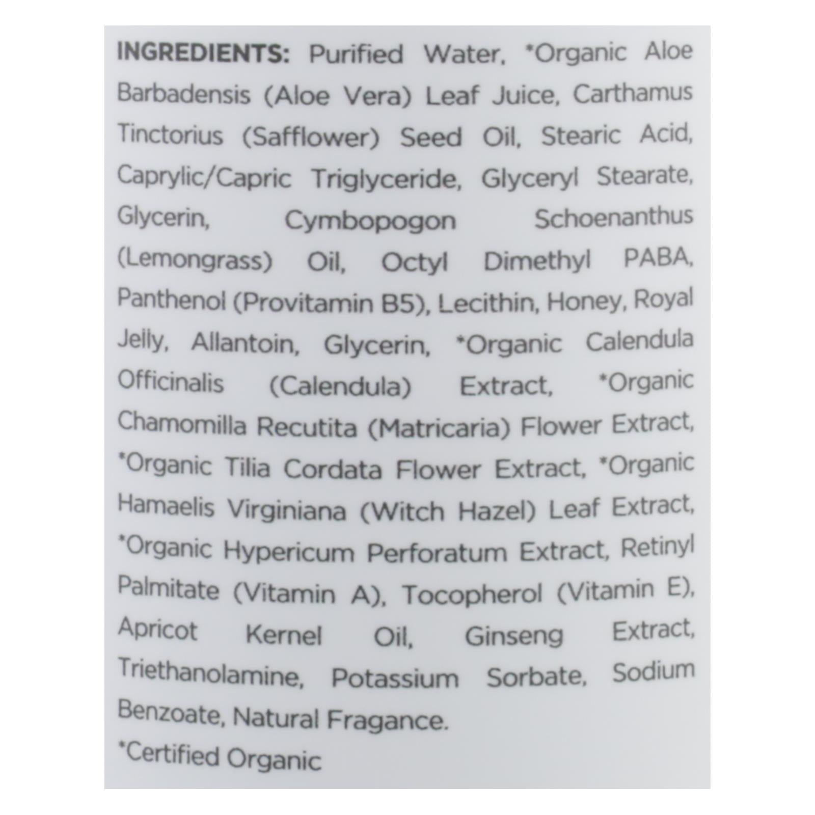 ingredients : purified water;organic aloe barbadensis;aloe vera;leaf juice;carthamus tinctorius;safflower;seed oil;stearic acid;caprylic/capric triglyceride;glyceryl stearate;glycerin;cymbopogon schoenanthus;lemongrass;oil;octyl dimethyl paba;panthenol;provitamin b5;lecithin;honey;royal jelly;allantoin;organic calendula officinalis;calendula;extract;organic chamomilla recutita;matricaria;flower extract;organic tilia cordata flower extract;organic hamaelis virginiana;witch hazel;leaf extract;organic hypericum