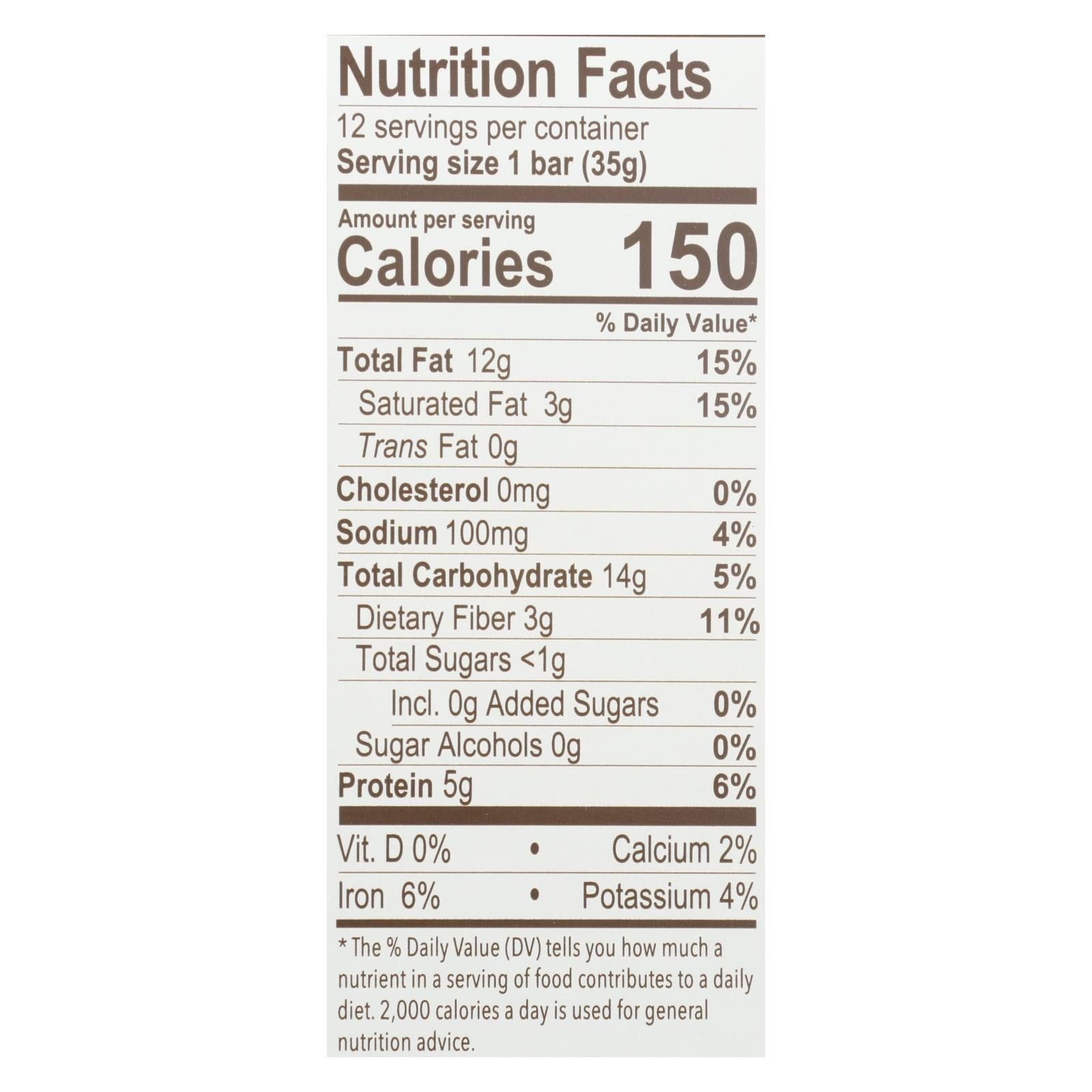 Naturally flavored. Less than 1 sugar; 3 g net carbs (3 g net carbs = total carb (15 g) - fiber (4 g) - allulose (8 g)); 5 g protein; 150 calories. See nutrition panel for fat content. Gluten free. Certified gluten-free. Low glycemic index. Non gmo. Non gmo project verified. Nongmoproject.org. Plant based. For all life's adventures. Made in usa with domestic and imported ingredients.