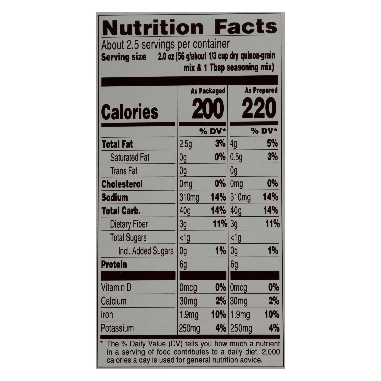 Flavor with other natural flavors. Per serving: 200 calories; 0 g sat fat (0% dv); 310 mg sodium (14% dv); less than 1 g total sugars. Non gmo project verified. Nongmoproject.org. At near east, we're inspired by how well the world eats. Our journey began 50 years ago with a single, homemade armenian rice pilaf recipe. Today, the brand has expanded to a family of hearty grains, blended with vibrant spices and herbs from across the globe. Our simple yet flavorful dishes provide creative inspiration for any meal. See side panel for additional product information. Package contains empty space to accommodate grain to seasoning ratio. This package is sold by weight, not by volume. Contents may settle during shipping and handling. Neareast.com. Smartlabel: scan for more food information or call 1-800-822-7423. We’re here to help. Neareast.com or 800.822.7423. Please have package available when calling. Fair trade certified ingredient quinoa: fair trade certified by fair trade usa. At least 40% of fair trade certified ingredients.