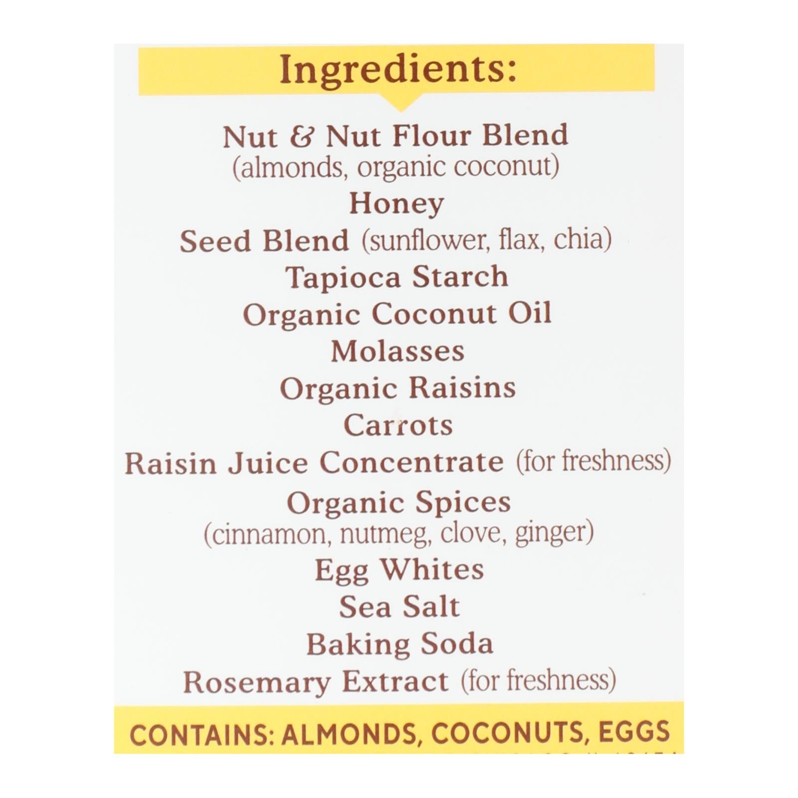 ingredients : nut & nut flour blend (almonds, organic coconut) organic coconut nectar seed & seed flour blend (sunflower, flax, chia) tapioca starch organic coconut oil molasses organic raisins carrots almond butter raisin juice concentrate (for freshness) egg whites organic spices (cinnamon, nutmeg, clove, ginger) sea salt baking soda rosemary extract (for freshness)