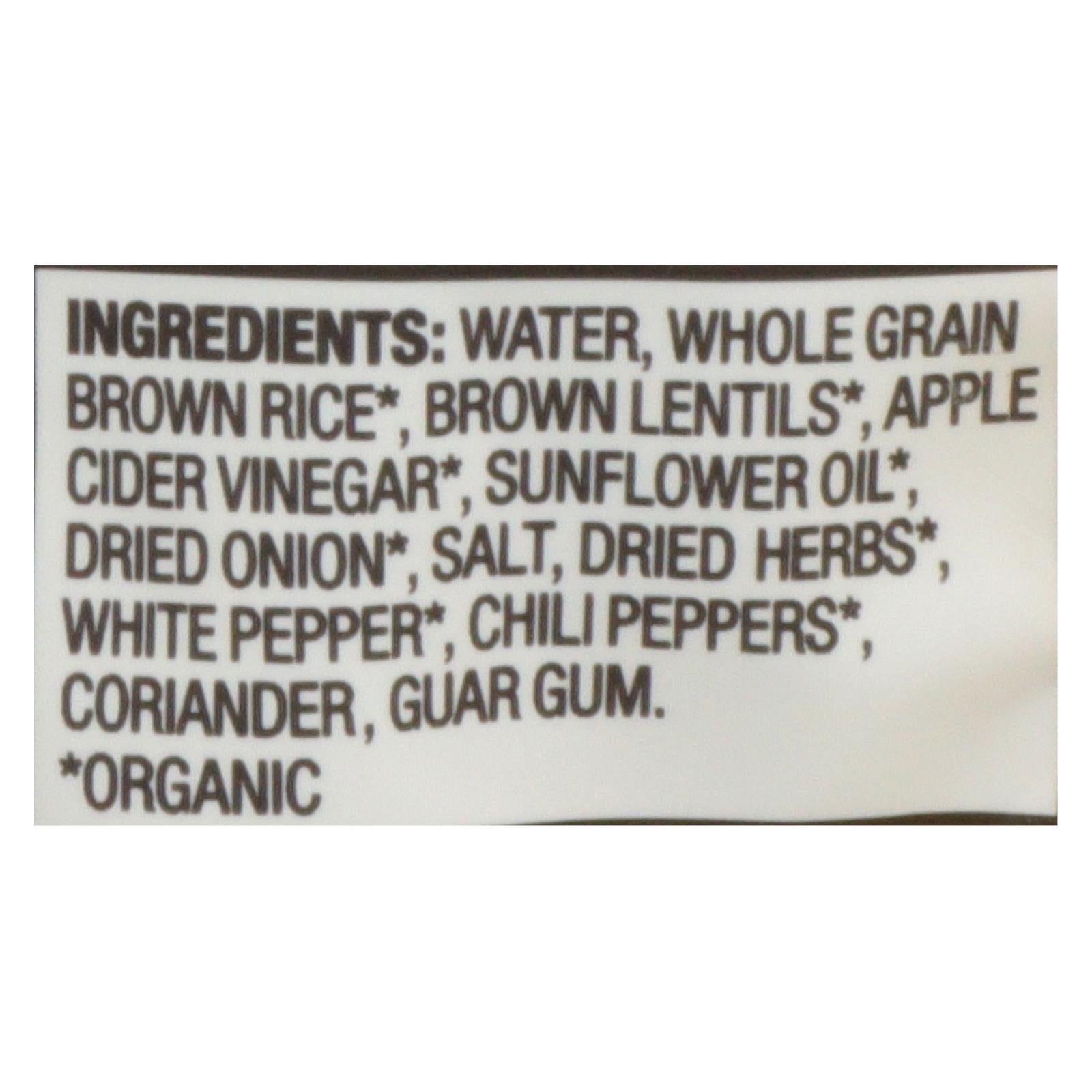 ingredients : water;whole grain brown rice;brown lentils;apple cider vinegar;sunflower oil;dried onion;salt;dried herb;white pepper;chili peppers;coriander;guar gum