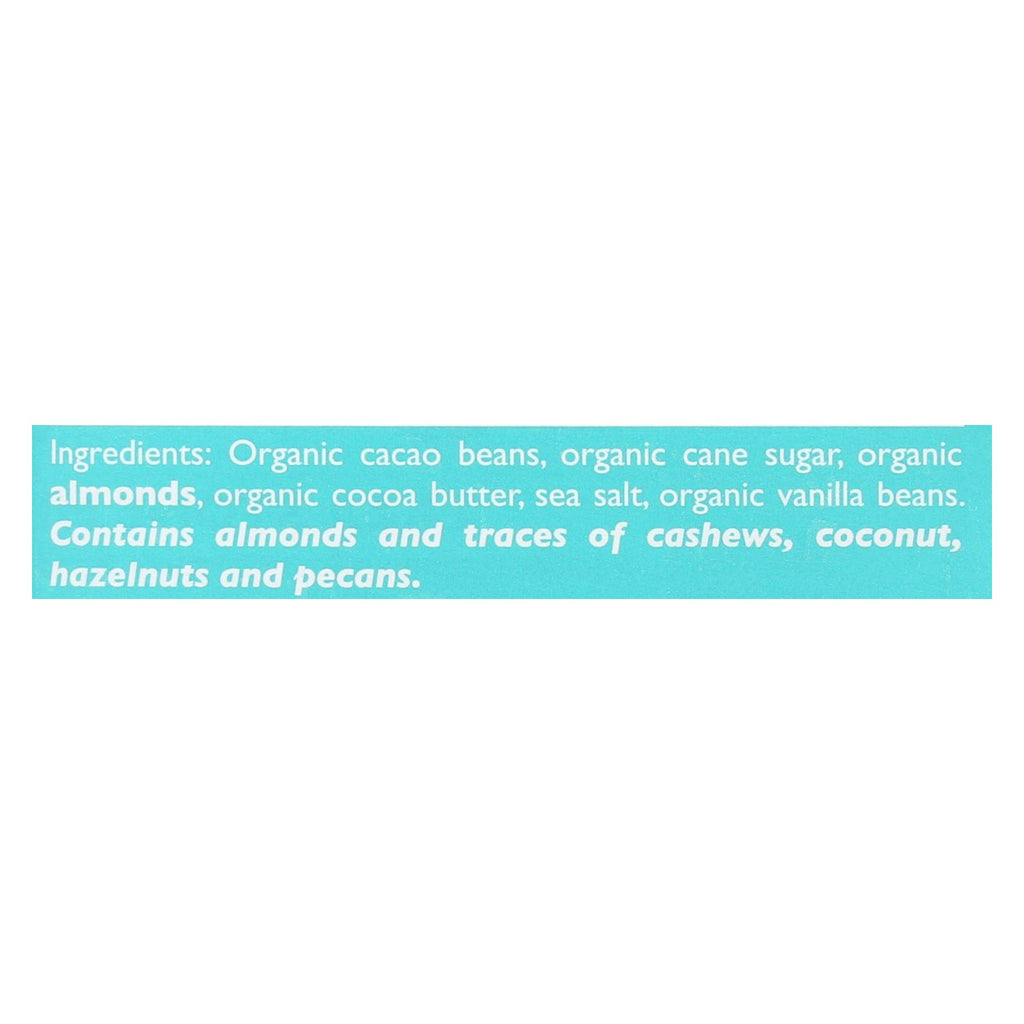 ingredients : organic cacao beans;organic cane sugar;organic almonds;organic cocoa butter;sea salt;organic vanilla beans