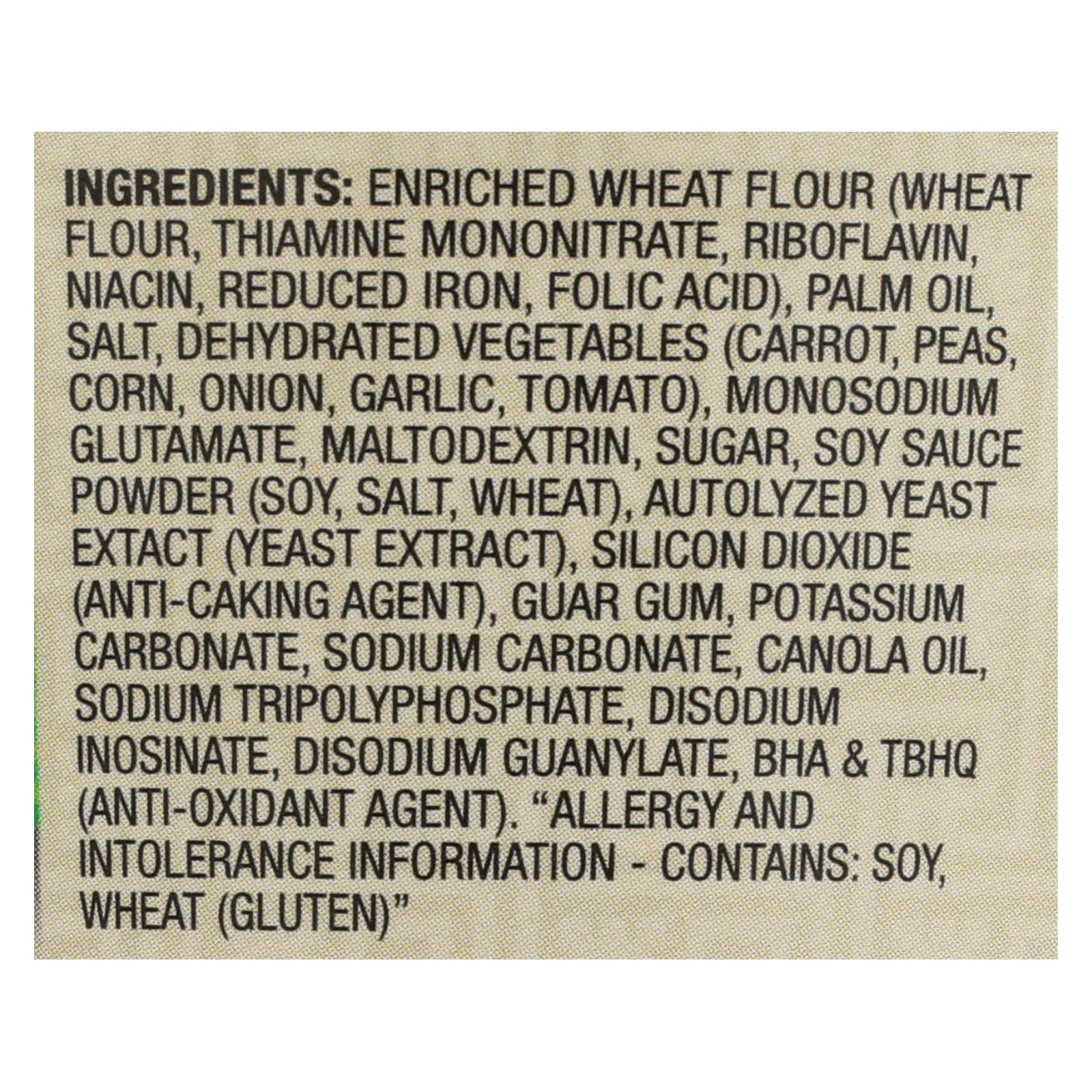 ingredients : enriched wheat flour;wheat flour;thiamine mononitrate;riboflavin;niacin;reduced iron;folic acid;palm oil;salt;dehydrated vegetables;carrot;peas;corn;onion;garlic;tomato;monosodium glutamate;maltodextrin;sugar;soy sauce powder;soy;wheat;autolyzed yeast extract;yeast extract;silicon dioxide;anti-caking agent;guar gum;potassium carbonate;sodium carbonate;canola oil;sodium tripolyphosphate;disodium inosinate;disodium guanylate;bha & tbhq;anti-oxidant agent