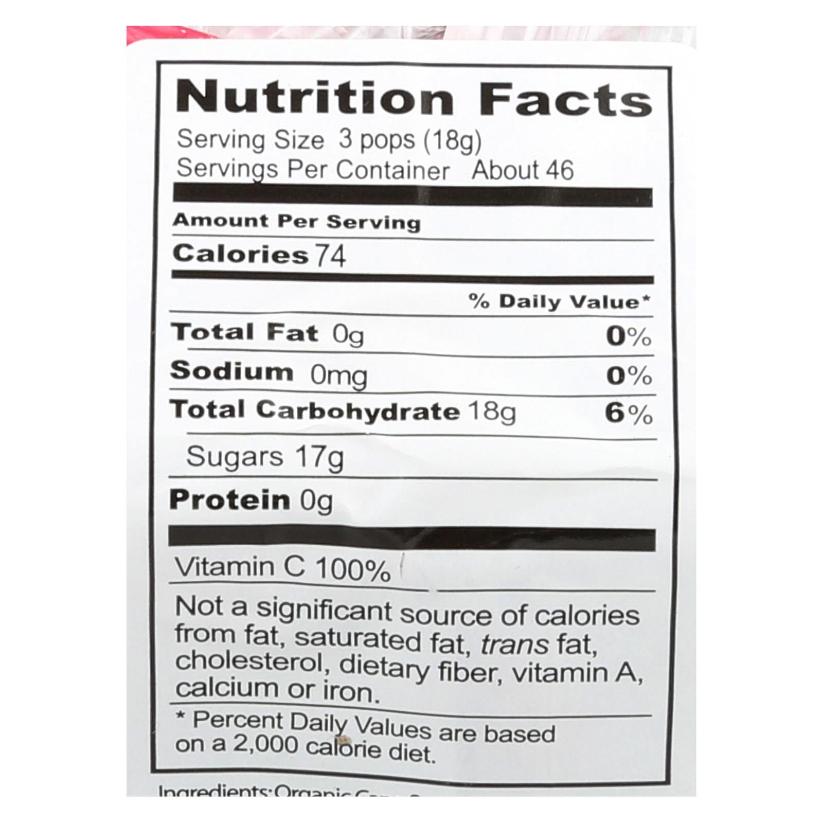 ingredients : organic cane sugar;organic rice syrup;citric acid;ascorbic acid;natural flavors;black carrot juice from concentrate;black currant juice from concentrate;organic annatto